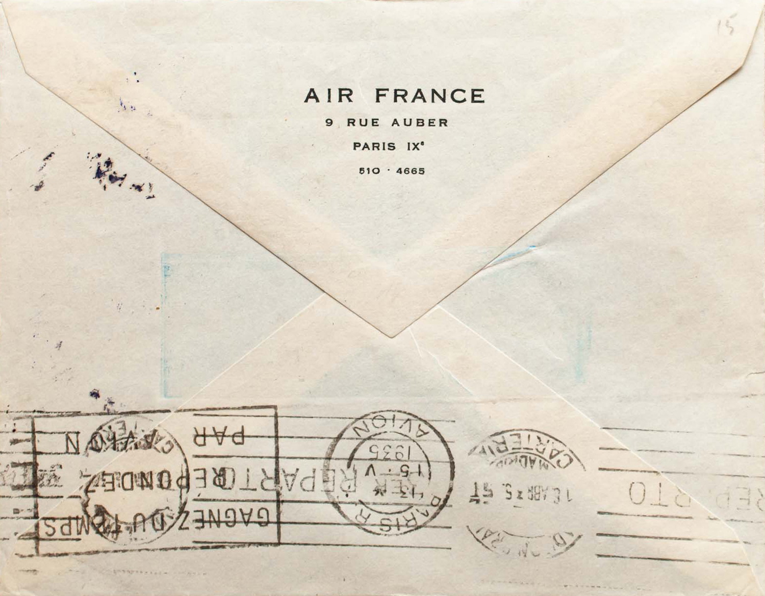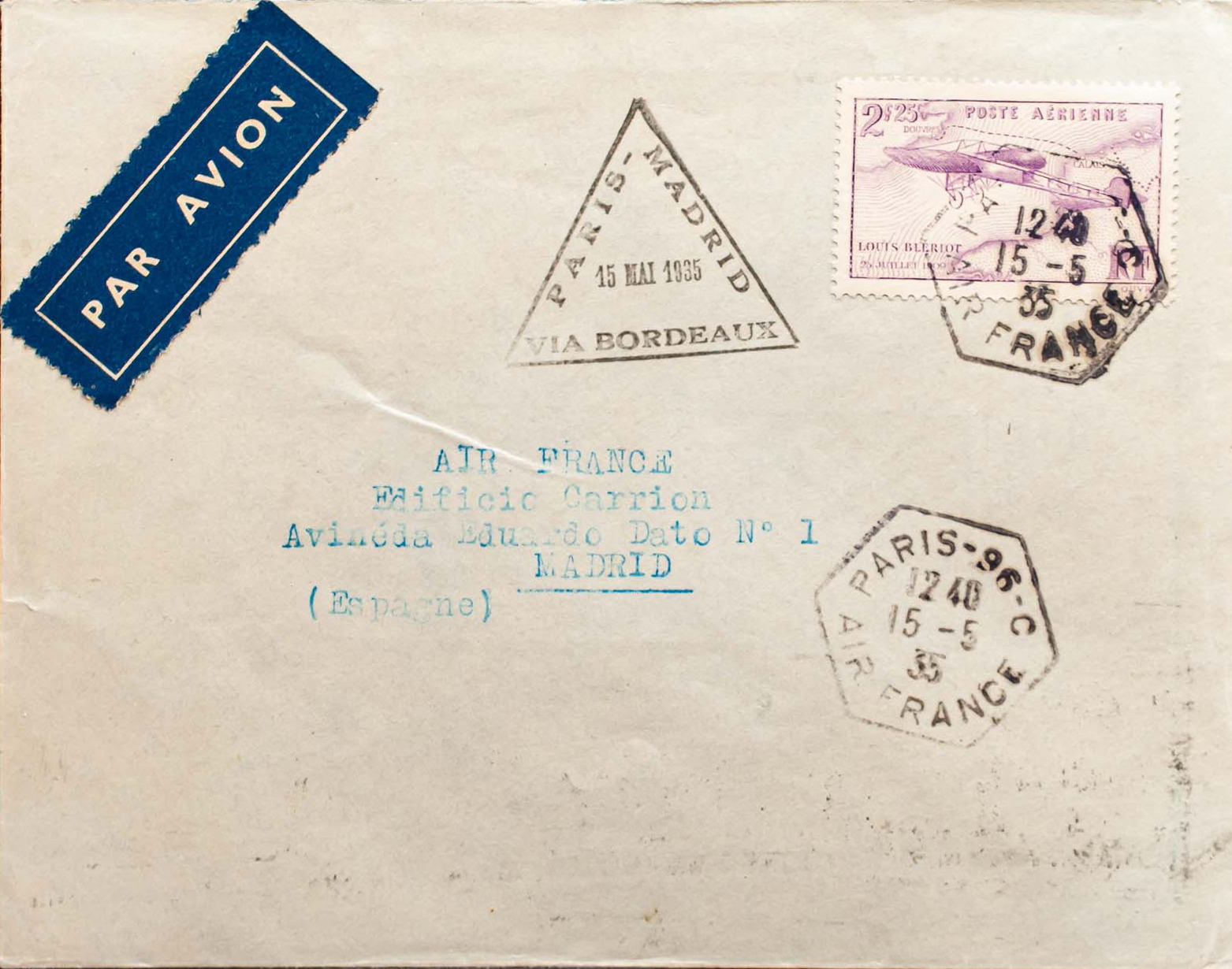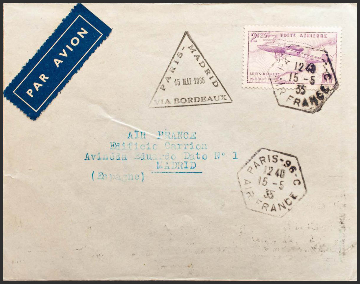 7. 1935. 2'25 f lilac. PARIS to MADRID. Hexagonal postmark PARIS-96-C / AIR FRANCE and on the front it marks PARIS-MADRID / VIA BORDEAUX, in black and on the back arrival. MAGNIFICENT AND RARE.