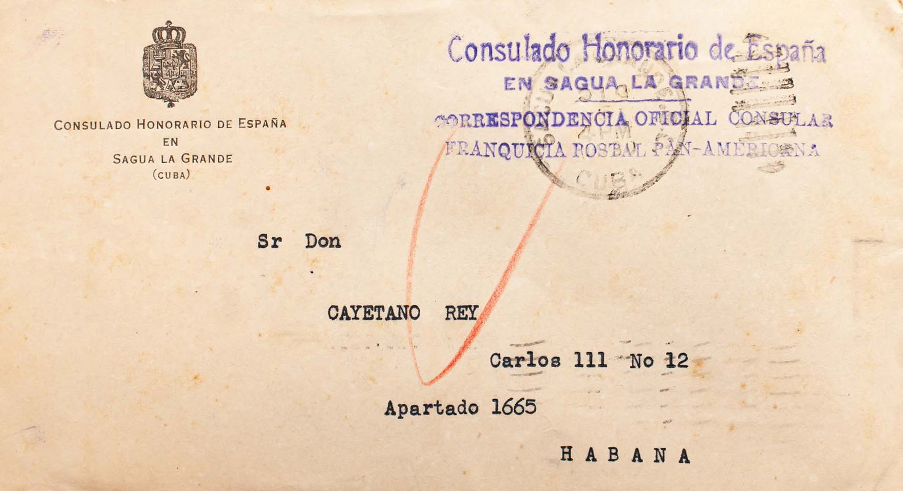 1930. SAGUA LA GRANDE to HAVANA. Mark HONORARY CONSULATE OF SPAIN / IN SAGUA LA GRANDE / OFFICIAL CONSULAR CORRESPONDENCE / PAN AMERICAN POSTAL FRANCHISE, in purple and arrival on the back. MAGNIFICENT AND RARE.