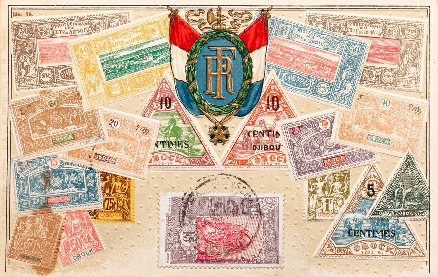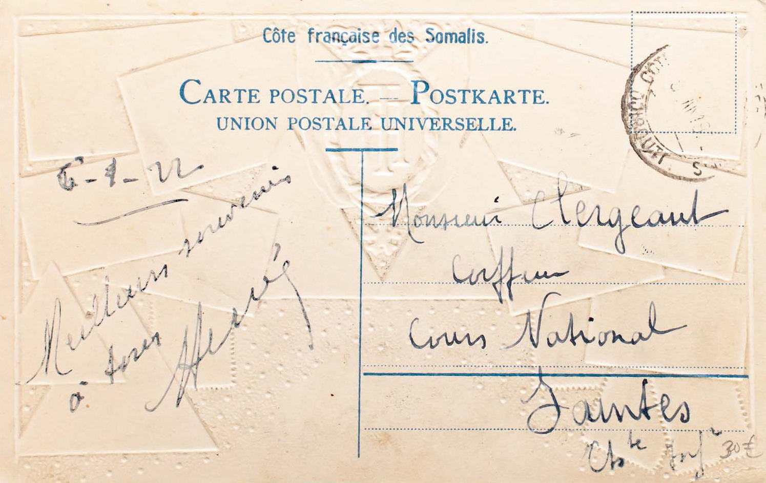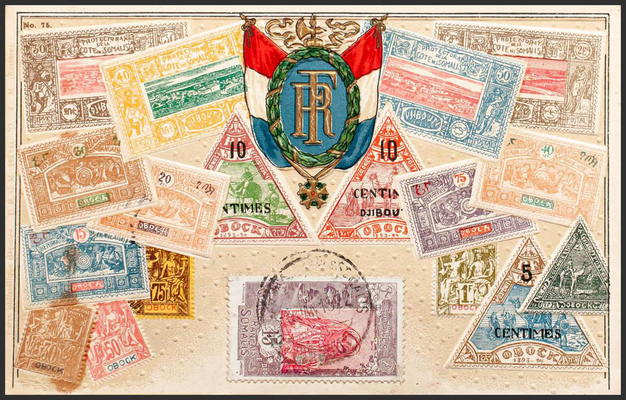 Yvert 88. 1922. 15 cts violet and pink. Illustrated Postcard with Djibouti and Obock stamps from DJIBOUTI to NANTES (FRANCE). Postmark COTE DE SOMALIS / DJIBOUTI. MAGNIFICENT.