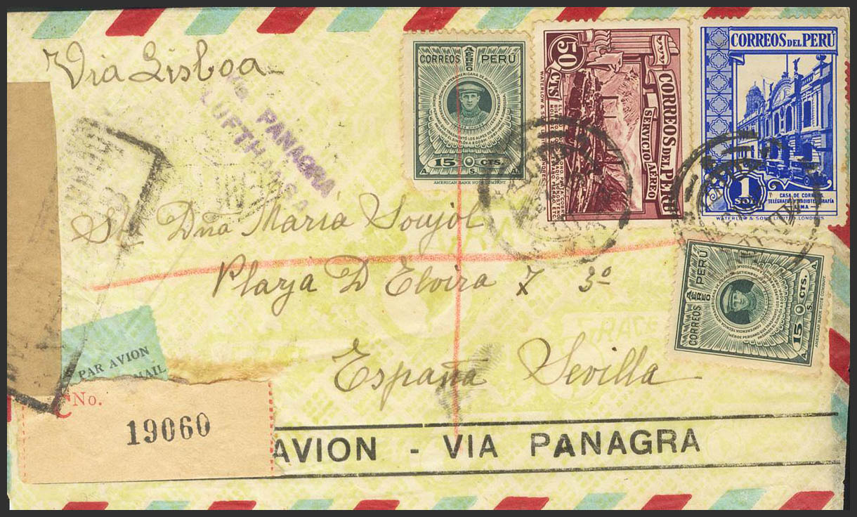 Yvert 353, Aereos 39, 46(2). 1937. 1 s overseas, 50 lilac chestnut cents and 15 cents green, two stamps. Air Mail from LIMA to SEVILLE. On the front it marks VIA PANAGRA / LUFTHANSA, in purple and on the back arrival. MAGNIFICENT.