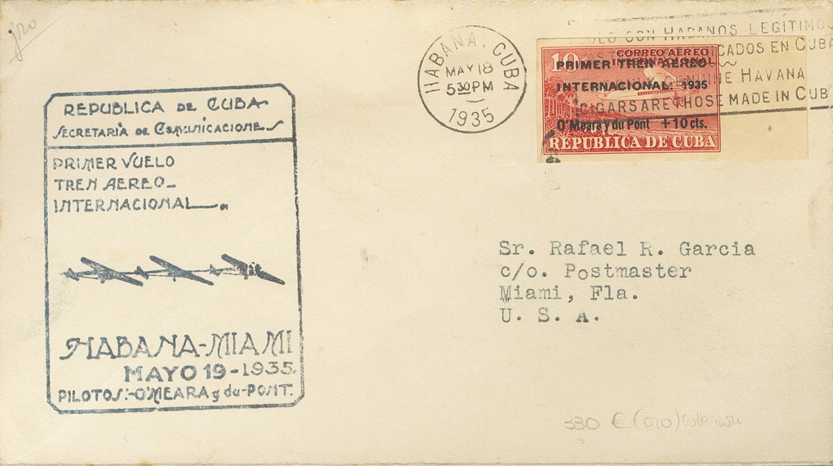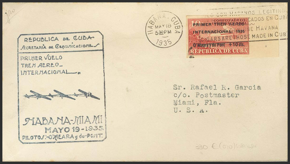 Yvert 16B. 1935. 10 cts on 10 cts red UNTOOTHED, leaf edge. HAVANA to MIAMI (USA). On the front it marks FIRST FLIGHT / INTERNATIONAL AIR TRAIN / HAVANA-MIAMI. MAGNIFICENT.