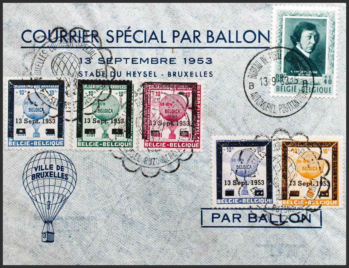 Yvert 893. 1953. 80 cts+40 cts green and complete series of Balloons from the Heysel Competition. Cover (uncirculated) COURRIER SPECIAL PAR BALLON. Commemorative postmark. MAGNIFICENT. (Cob E64/68)