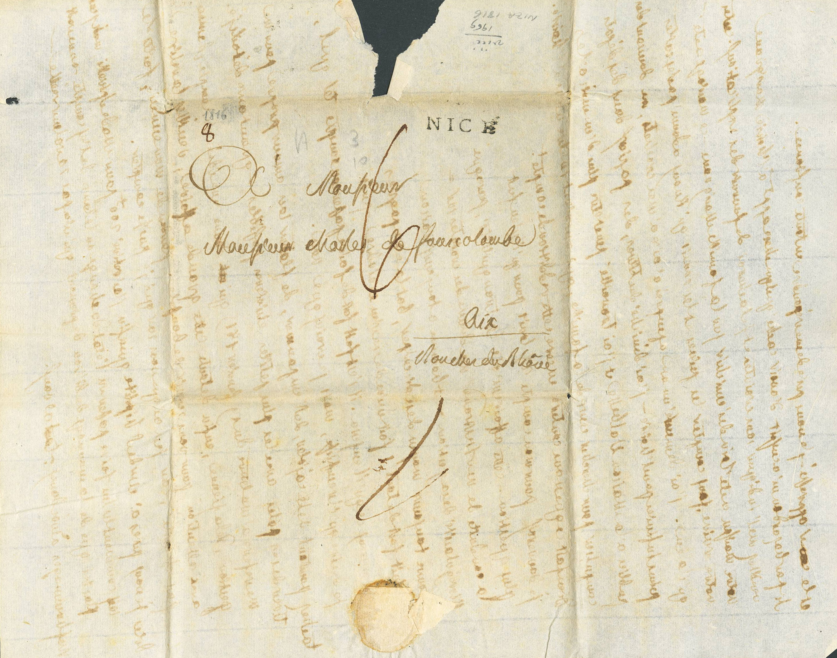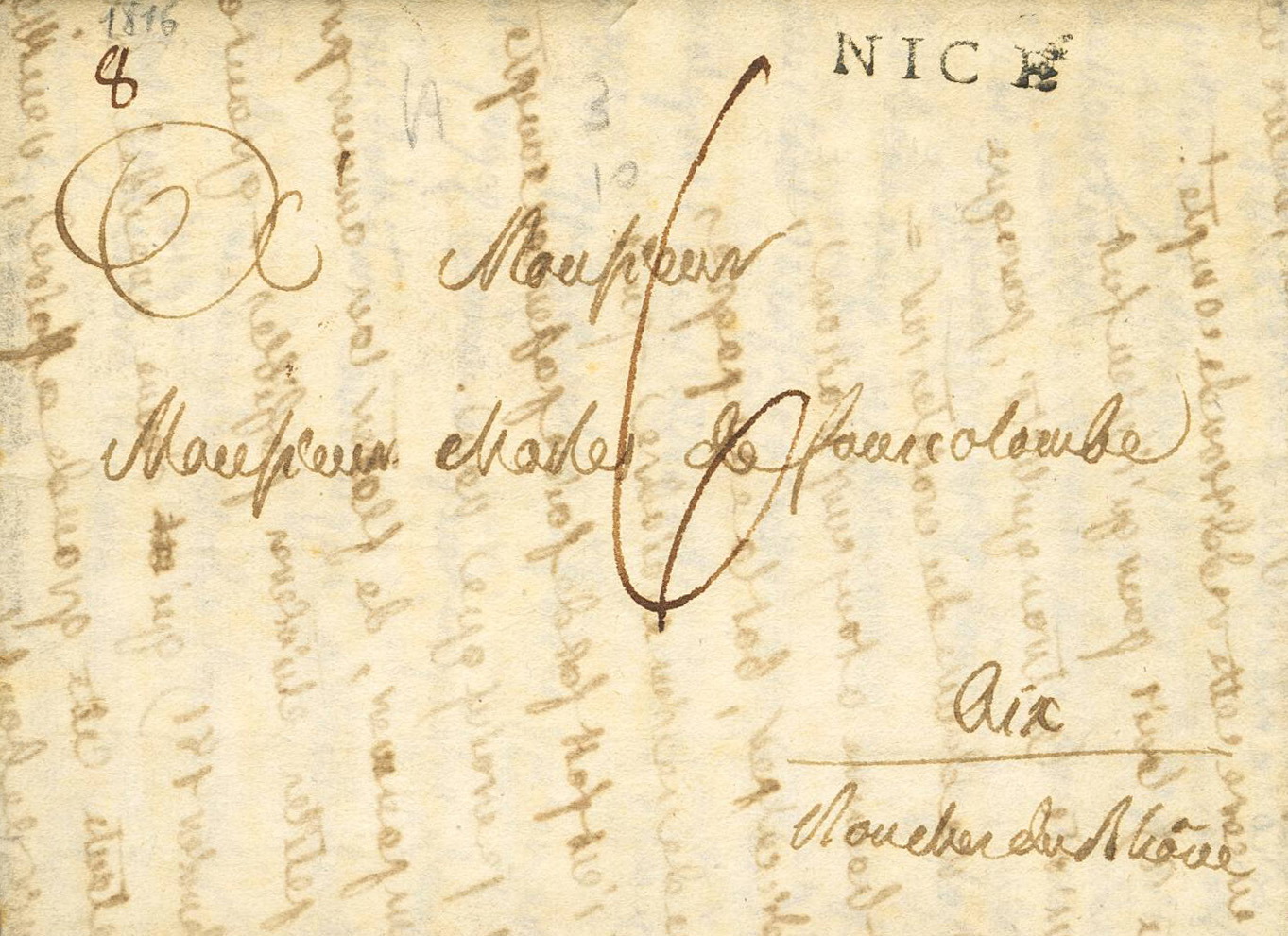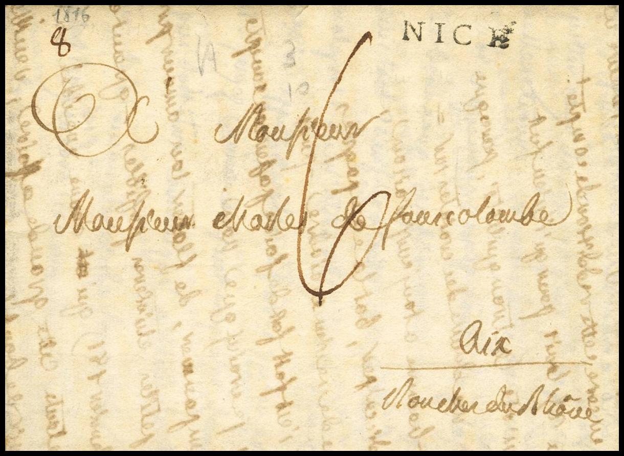 1816. NICE to AIX EN PROVENCE. NICE mark and handwritten portage "6". MAGNIFICENT. (Vollmeier 42)