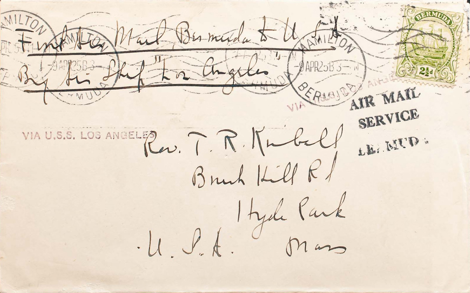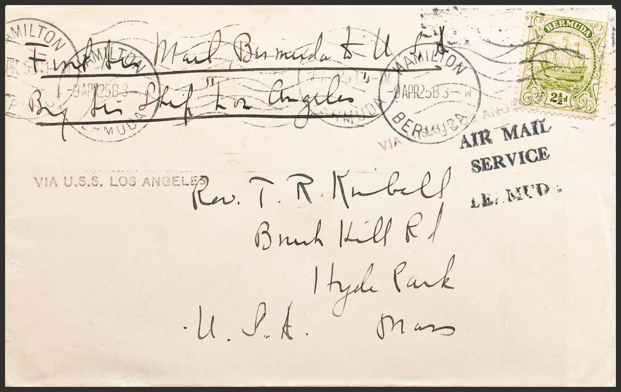 English Yvert 77. 1925. 2½ p green yellow. HAMILTON to HYDE PARK (USA), transported aboard the Zeppelin "LZ126" LOS ANGELES. On the front it marks AIR MAIL / SERVICE / BERMUDA and linear VIA USA LOS ANGELES, stamped twice. MAGNIFICENT AND RARE. (Sieger 20P)