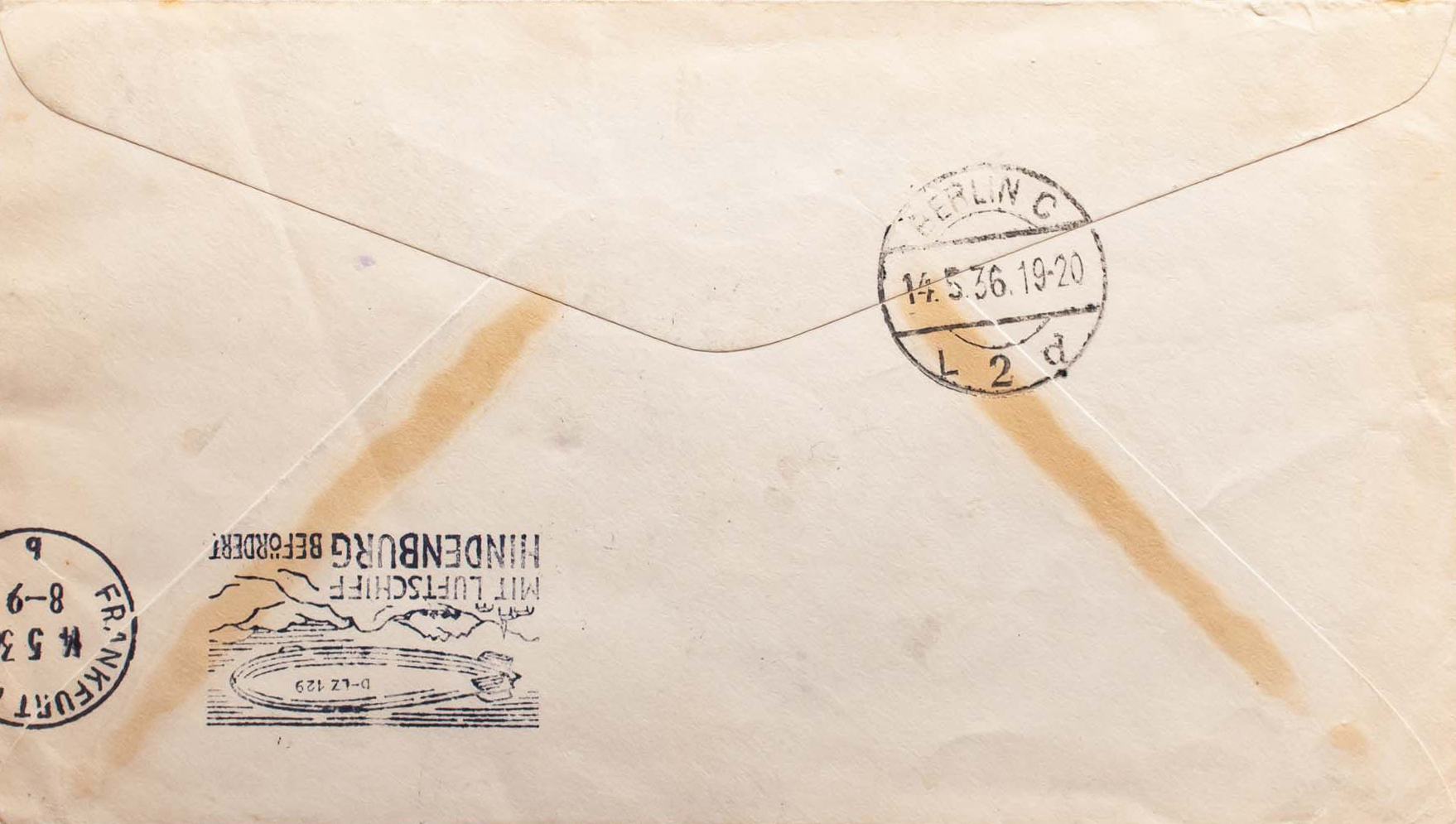 Yvert 15A(4). 1936. 6 orange cents, four stamps, 3 violet cents and 15 black cents. NEW YORK to BERLIN (GERMANY), reshipped to FRANKFURT and transported aboard the Zeppelin "Hindenburg", on the first trip to North America. Marked LAKEHURST / TRANSATLANTIC / FIRST FLIGHT / FRANKFURT AM MAIN, in purple and on the back roller MIT LUFTSCHIFF / HINDENBURG BEFÖRDERT, arrival. MAGNIFICENT AND RARE.