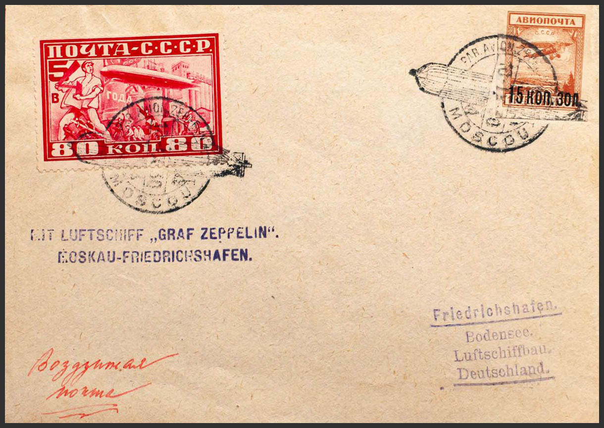 Yvert 16, 20. 1941. 15 k on 1 r yellow chestnut and 80 k carmine. Graf Zeppelin from MOSCOW to FRIEDRICHSHAFEN. ZEPPELIN / MOSCOU PLANE PAIR postmark and flight mark on the front and arrival on the back. MAGNIFICENT.