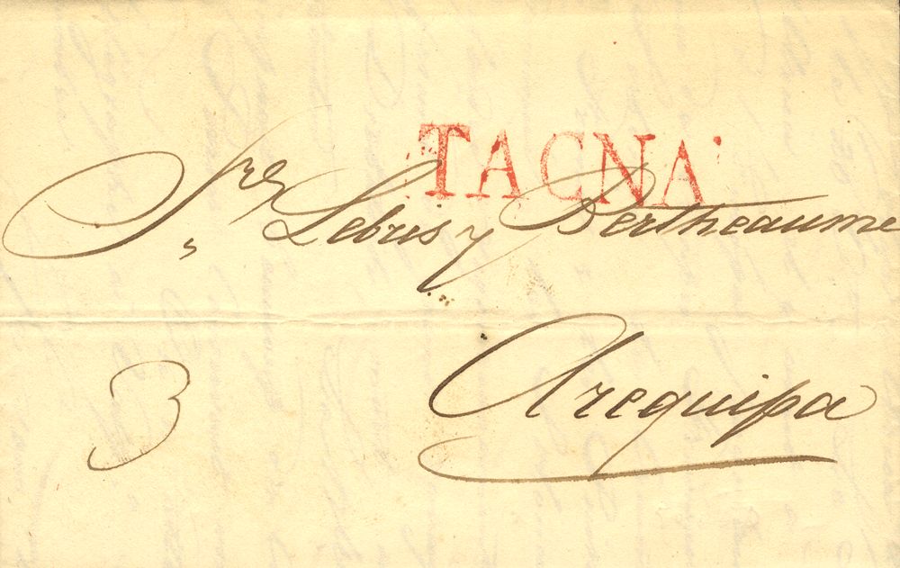 (1831ca). TACNA to AREQUIPA. TACNA brand, in red (Colareta 2). MAGNIFICENT.