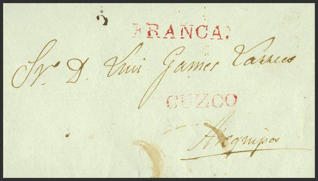 (1834ca). CUSCO to AREQUIPA. CUZCO brand, in red (Colareta 6) and FRANCA, in red (Colareta 6f). MAGNIFICENT.
