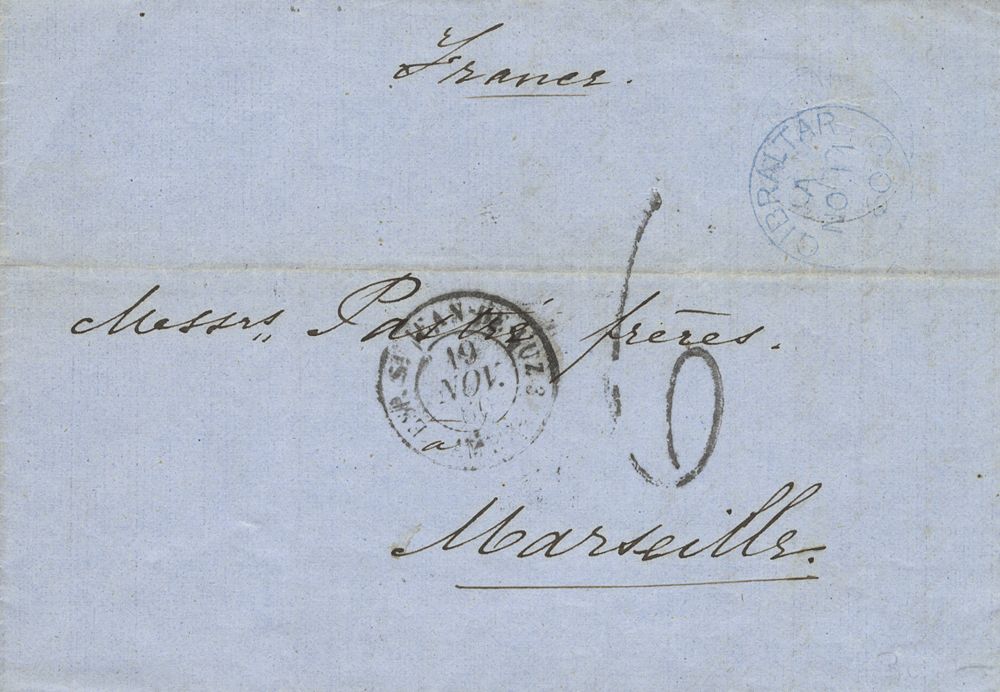 English 1860. GIBRALTAR to MARSEILLE (FRANCE). GIBRALTAR small dater, in blue. MAGNIFICENT.