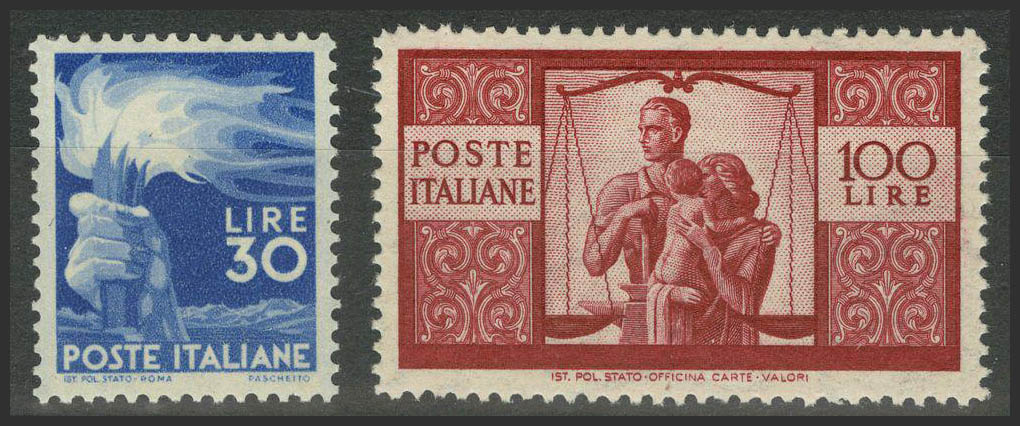 English ★★Yvert 501, 503. 1945. 30 l blue and 100 l red. Key values. Excellent centers. MAGNIFICENT. Certificate BOLAFFI. Yvert 2012: 1,080 Euros