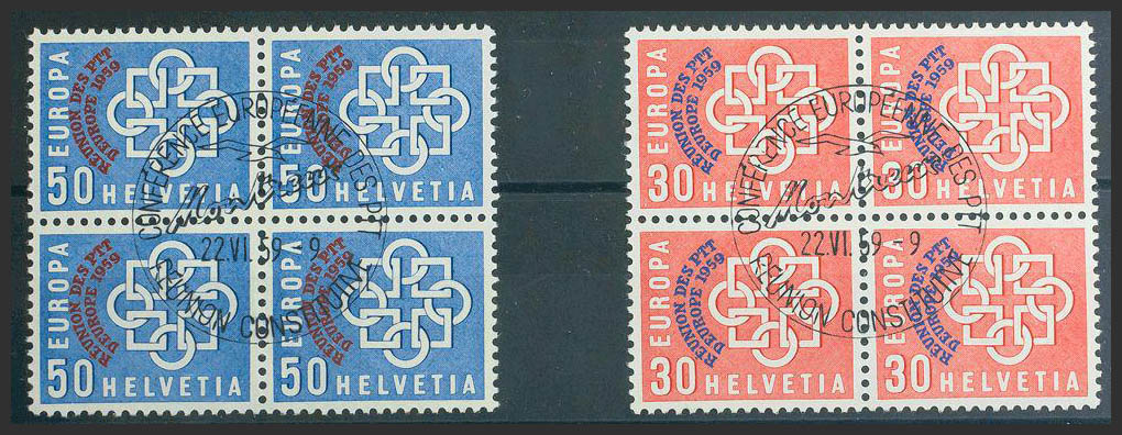 Yvert 632/33(4). 1959. Complete series, block of four. Commemorative postmark. MAGNIFICENT.