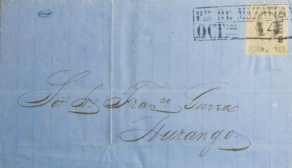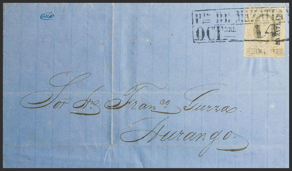 English Yvert 8. 1862. 2 reales grey. MAZATLAN to DURANGO. Postmark PTO DE MAZATLAN. MAGNIFICENT AND RARE.