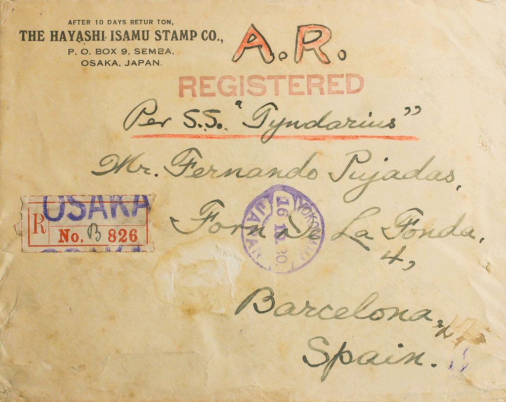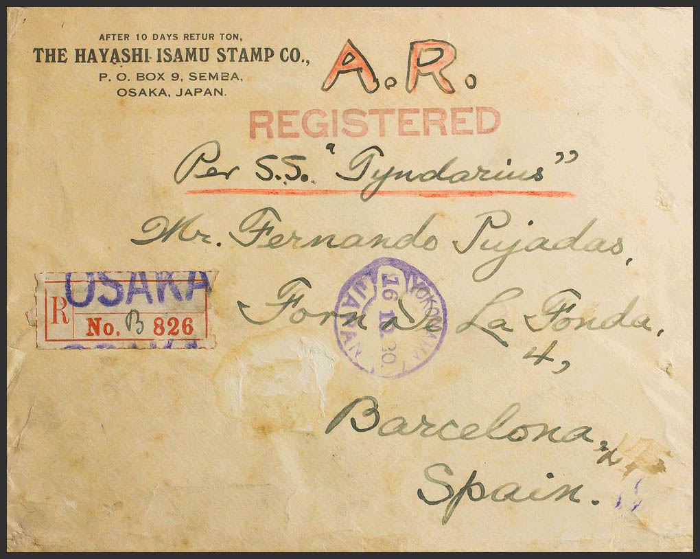 Yvert 129, 137(3), 153(2). 1920. Orange 1s, blue 10s, three stamps, and green 3s, two stamps (all on back). Certificate from OSAKA to BARCELONA. On the back arrival. MAGNIFICENT.