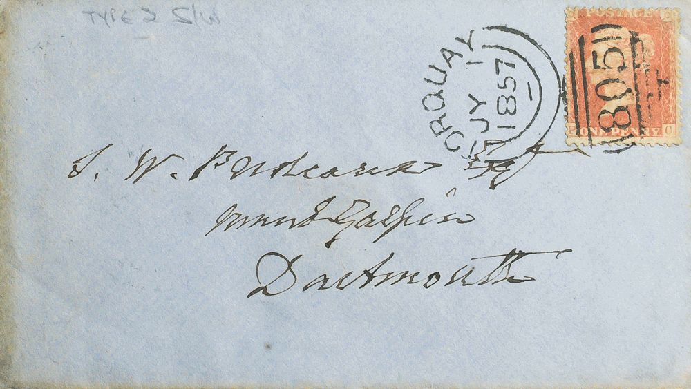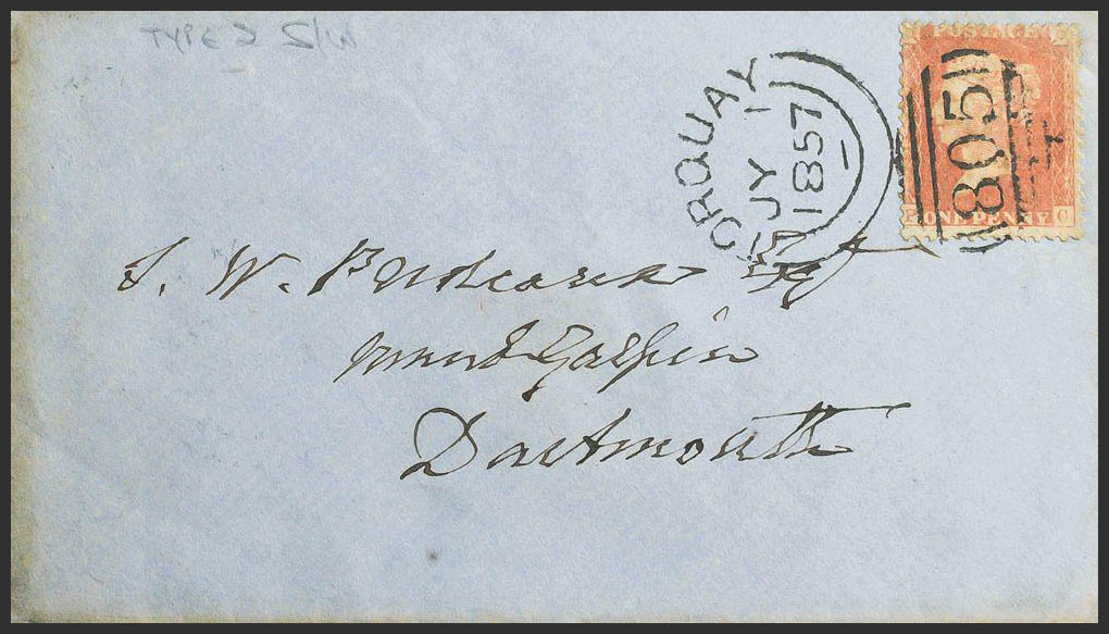 English Yvert 14. 1857. 1 p carmine red. TORQUAY to DARTMOUTH. Postmark TORQUAY / 805. MAGNIFICENT.