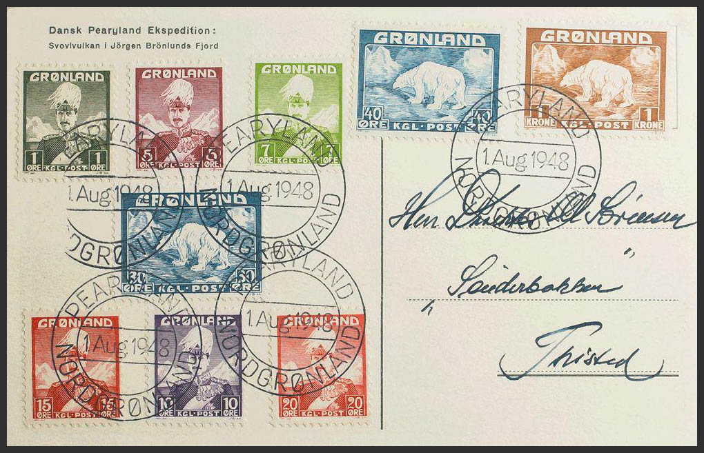 English Yvert 1/9. 1948. Complete series. Postcard from PEARYLAND to THISTED (DENMARK). MAGNIFICENT.