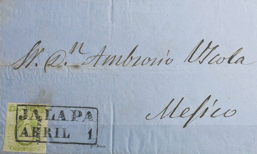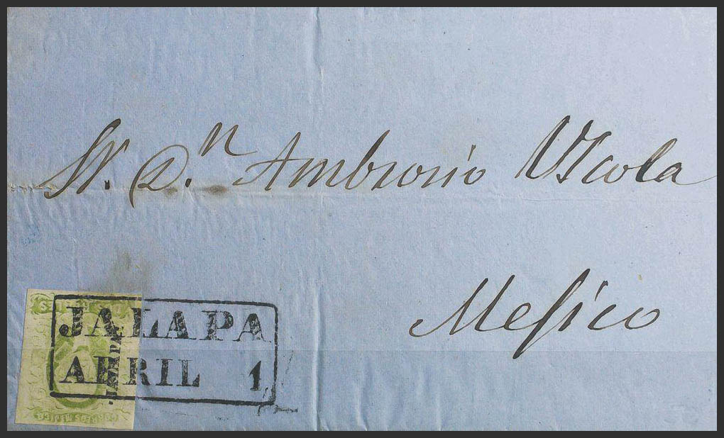 Yvert 3. (1856ca). 2 reales green yellow. JALAPA to MEXICO. Postmark JALAPA / APRIL 1. MAGNIFICENT.