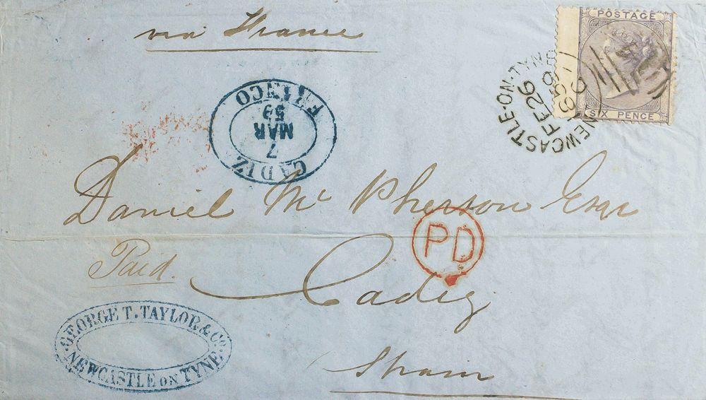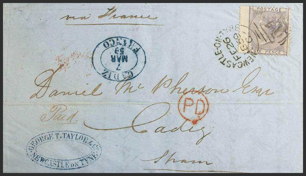 Yvert 19. 1859. 6 p lilac. NEWCASTLE to CADIZ (SPAIN). On the front brand CADIZ / FRANCO, in blue. MAGNIFICENT.