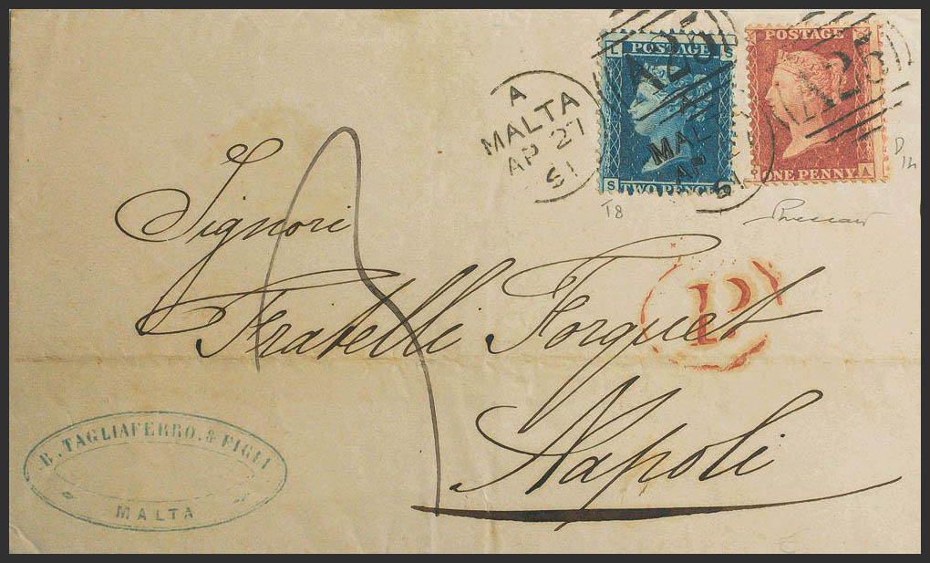 Yvert Great Britain 14, 27. 1861. 1 p red and 2 p blue Plate 8. MALTA to NAPLES (ITALY). Duplex postmark MALTA / A25. MAGNIFICENT AND RARE.