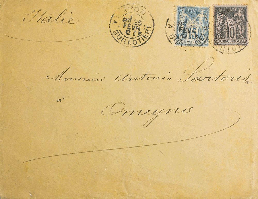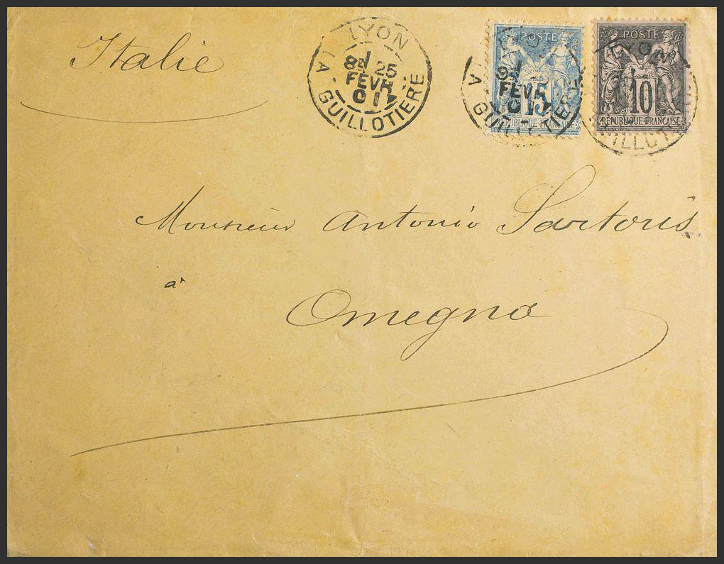 Yvert 89, 90. 1901. 10 cts black on lilac and 15 cts blue. LYON to OMEGNA (ITALY). On the back arrival. MAGNIFICENT.