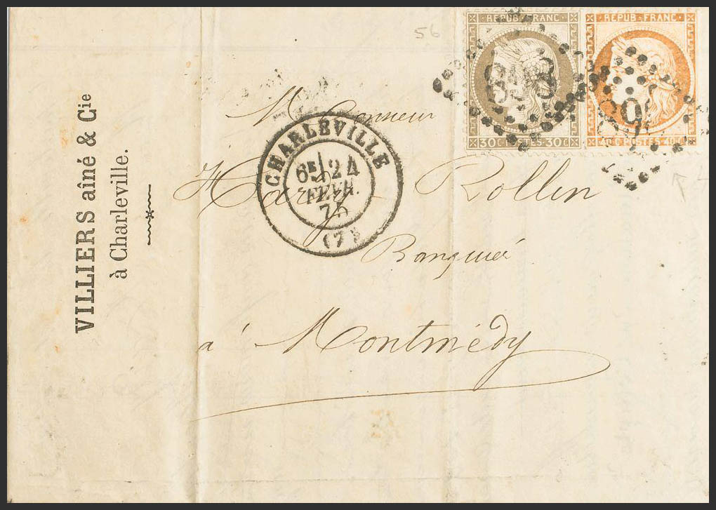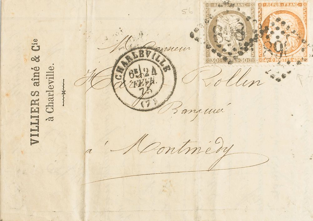 Yvert 38, 56. 1875. 40 cts orange and 30 cts chestnut. CHARLEVILLE to MONTMEDY. Rhombus postmark with large figures Nº898. MAGNIFICENT.