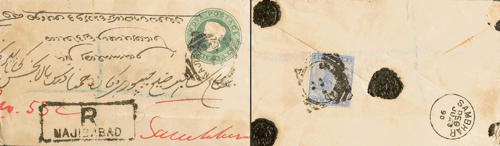 Yvert 37. 1890. 1/2 green on Certified Postal Stationery from MAJIBABAD to SAMBHAR, with additional postage of 2 overseas. MAGNIFICENT.