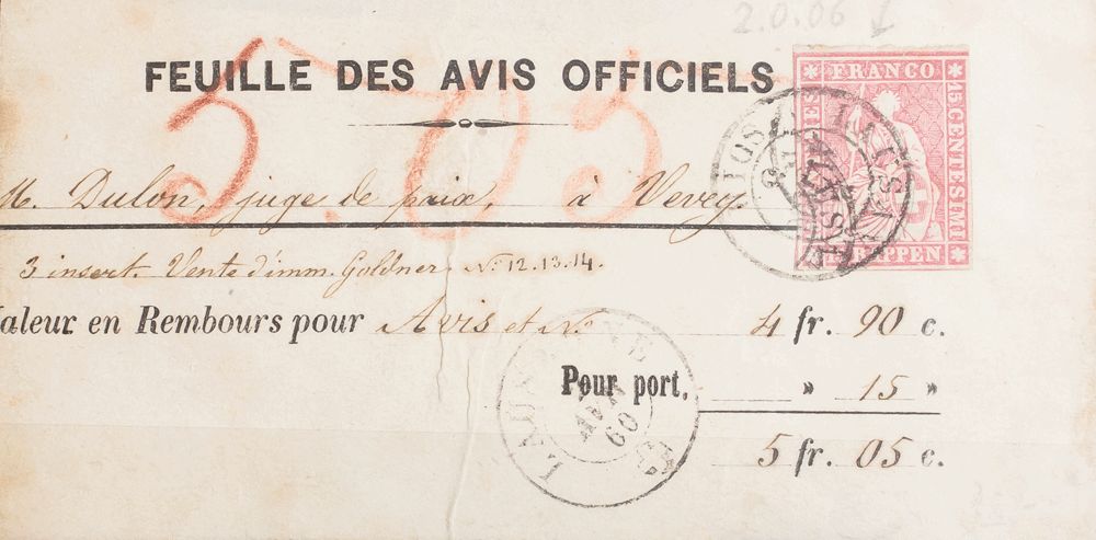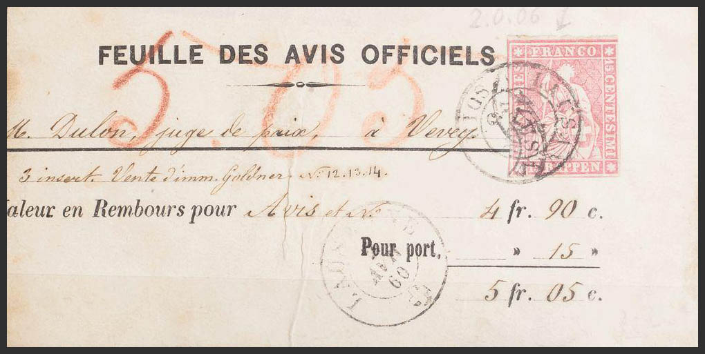 Yvert 28. 1860. 15 rp pink. Newspaper strip from LAUSANNA to VEVEY. Date postmark LAUSANNE / SOIR. MAGNIFICENT.