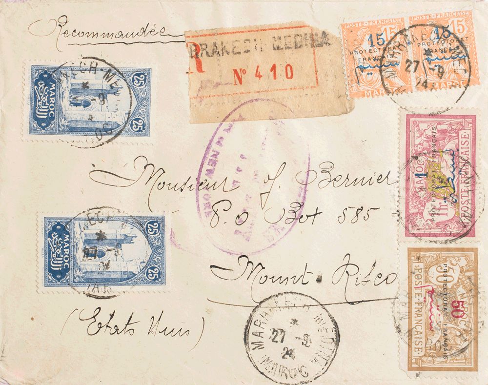 English Yvert 42(2), 50, 51, 70(2). 1924. 15 cts on 15 cts orange, 50 cts on 50 cts chestnut, 1 p on 1 fr carmine and 25 cts blue, two stamps. Certificate from MARRAKECH to MOUNT KISCO (USA). On the back arrival. MAGNIFICENT.