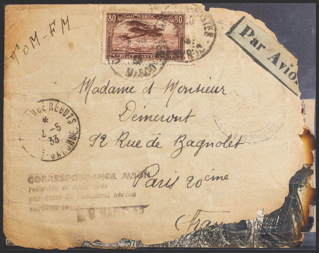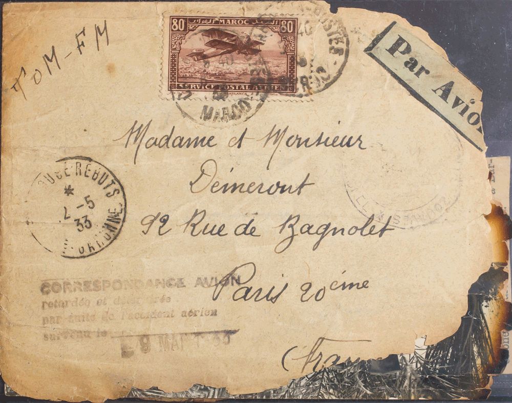 English 1933. Air accident that occurred on March 9, 1933, in the plane that covered the CASABLANCA-PARIS line, carrying three passengers, suffers a mishap near Barcelona, killing all the passengers (including its pilots Reiguelle and Emier, part of the correspondence is recovered partially burned) and the mark CORRESPONDANCE AVION RETARDEE ET DETERIORE PAR SUITE DE L'ACCIDENT AERIEN is added, the letter is inserted in an official envelope where it is sent to the final recipient (a newspaper clipping from the time is included mentioning the accident). MAGNIFICENT AND VERY RARE COMPLETE SET WITH ALL THE DOCUMENTATION.