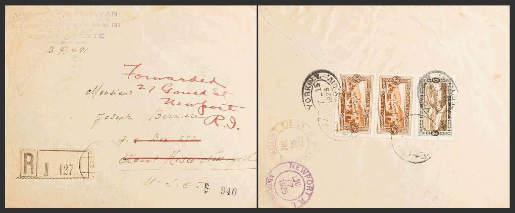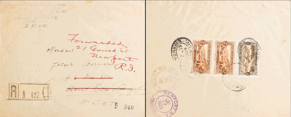 Yvert 57, 59(2). 1925. 2 fr sepia and 3 fr chestnut, two stamps (all stamps franked on the back). Certificate from BEIRUTH to MOUNT KISCO (USA), forwarded to NEWPORT. On the back arrival. MAGNIFICENT.