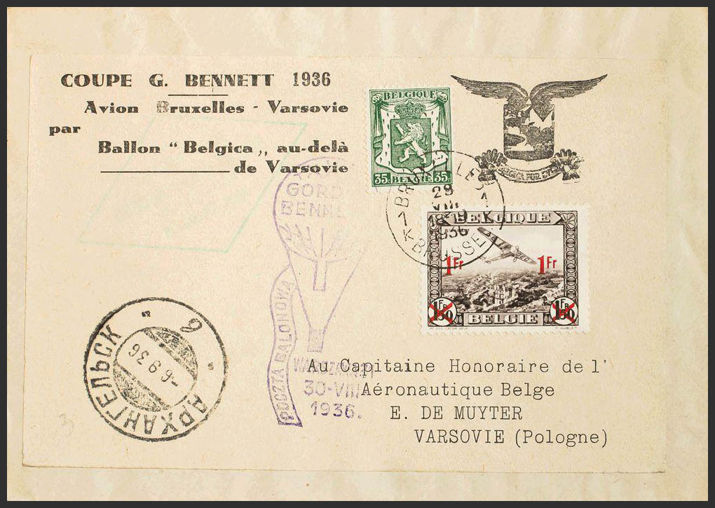 Yvert Aéreo 6, 425. 1936. 35 green cts and 1 fr over 1'50 air fr. BRUSSELS to WARSAW (POLAND). Circulated by Hot Air Balloon, on the front Belgian and Polish marks THE GORDON BENNETT CUP and the corresponding arrival. MAGNIFICENT AND RARE.