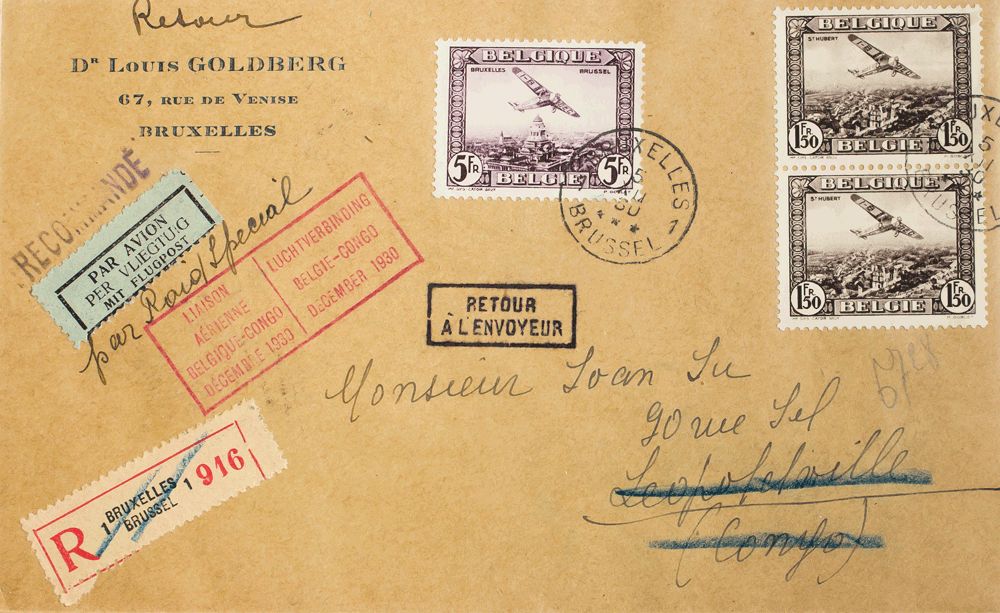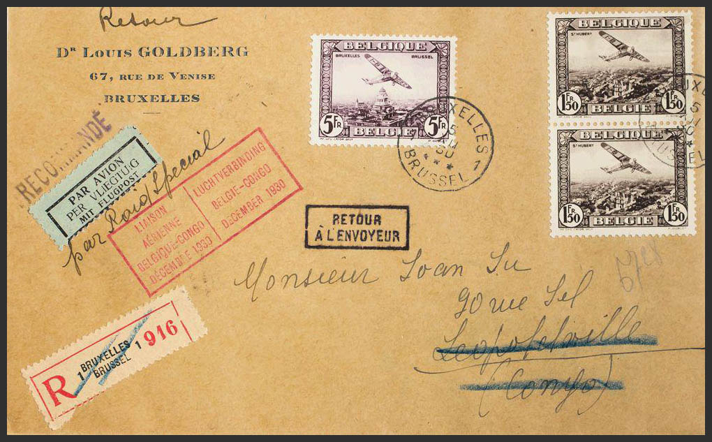 Yvert 2(2), 5. 1930. 1.50 fr black chestnut, two stamps and 5 fr violet. Certificate from BRUSSELS to LEOPOLDVILLE, BELGIAN CONGO, returned to sender. On the front LIAISON / AERIENNE / BELGIQUE-CONGO / DECEMBRE 1930, in French and Flemish, arrival on the back. MAGNIFICENT.