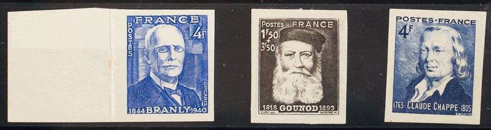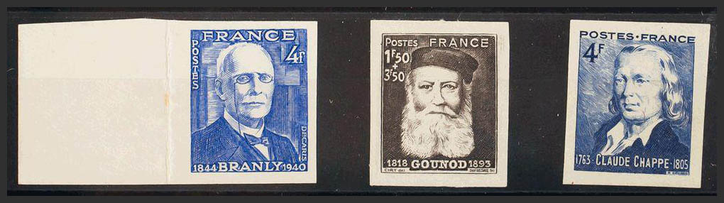 ★Yvert 599a, 601a, 619a. 1944. 4 fr overseas, 1.50 fr + 3.50 fr sepia and 4 fr blue. NO TEETH. MAGNIFICENT. Yvert 2014: 92 Euros