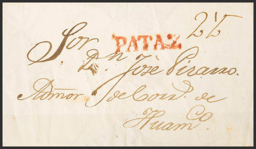 (1826ca). PATAZ to HUAMACHUCO. PATAZ mark, in red (Colareta 1) and portage "2 ½", handwritten. MAGNIFICENT AND VERY RARE.