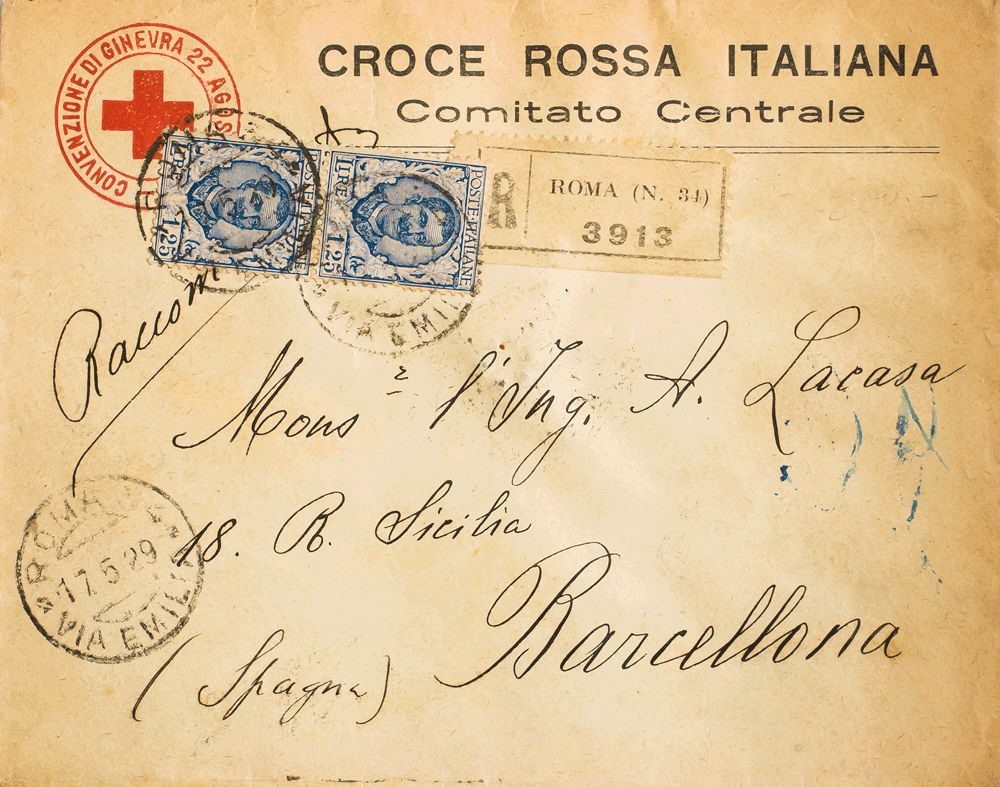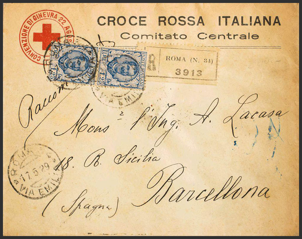 Yvert 184(2). 1929. 1.25 blue and ultramarine lire, two stamps. Preprinted Cover of the Croce Rossa Italiana Certified from ROME to BARCELONA (SPAIN). On the back arrival. MAGNIFICENT AND RARE.