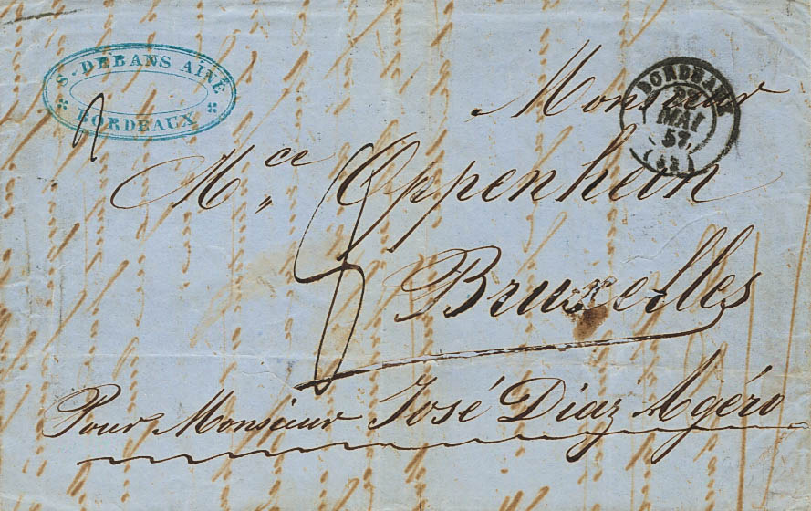 1857. BORDEAUX to BRUSSELS. Handwritten portage of "8 décimas", various street vendors and arrival on the back. MAGNIFICENT.