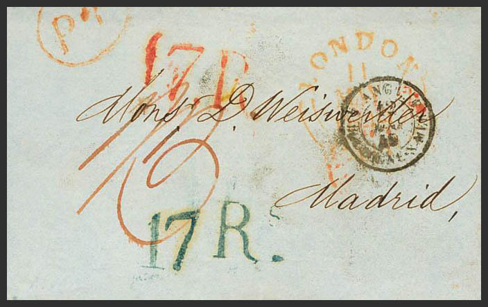 1849. LONDON to MADRID. Mark double arch LONDON / PAID, handwritten portage 1/3 sh (prepaid) and double portage (in blue and red), on arrival "17R" (reales). MAGNIFICENT.