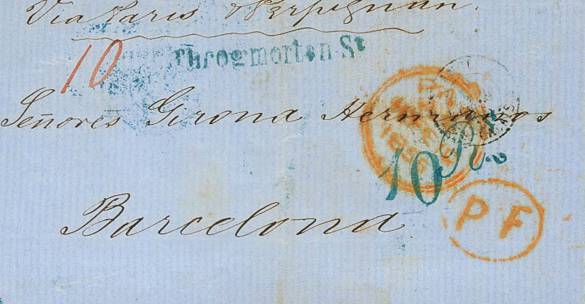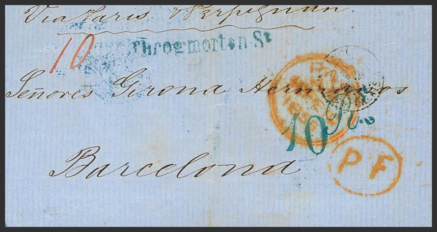 English 1855. LONDON to BARCELONA. Circulated via Paris and Perpignan. MAGNIFICENT.
