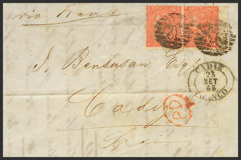 Yvert 32(2). 1866. 4 p red Plate 8, pair (archival fold). LONDON to CADIZ, circulated via France. On the front oval dater CADIZ / FRANCO. MAGNIFICENT.