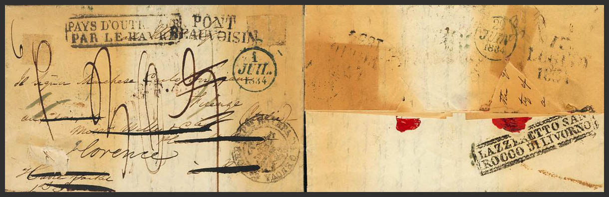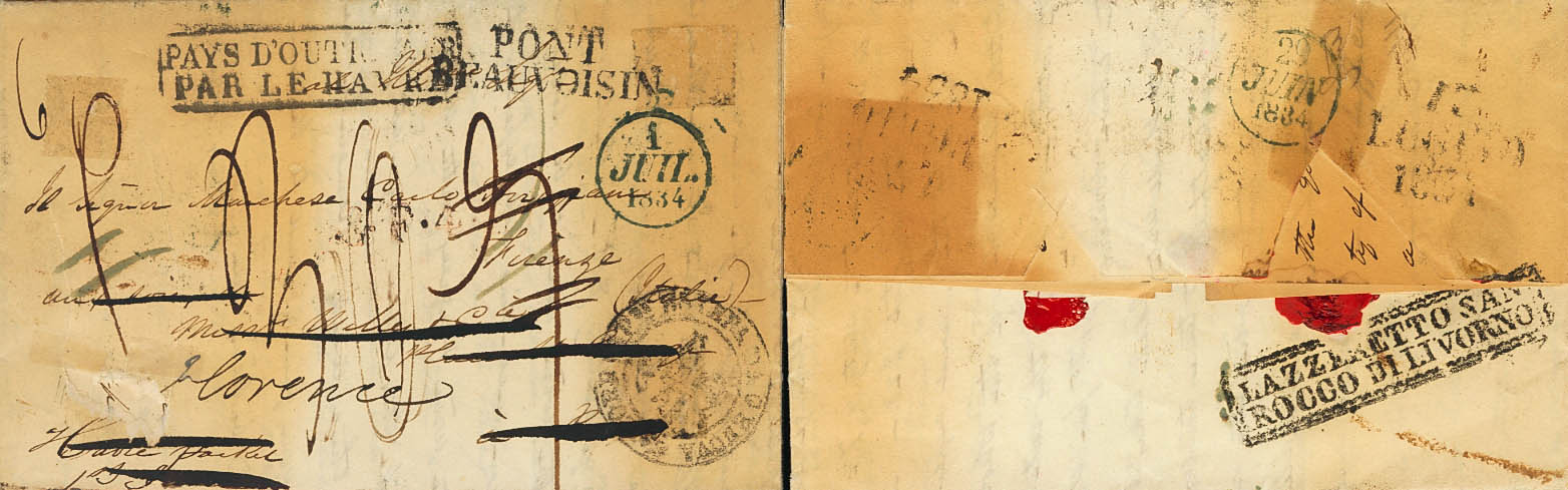 1834. NEW YORK to LE HAVRE, and forwarded to FLORENCE (ITALY) (sanitized letter). PAYS D´OUTRAMER / PAR LE HAVRE brand on the front, various rates (some of them rectified), LAZZARETO SAN / ROCCO DI LIVORNO brand on the back. MAGNIFICENT.