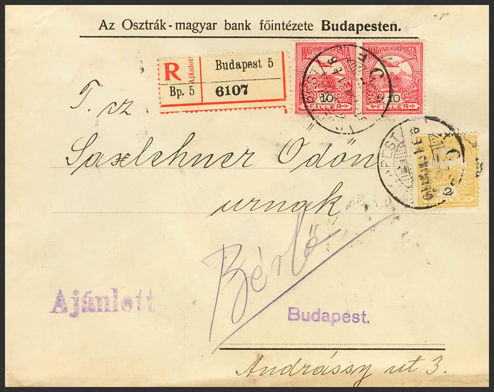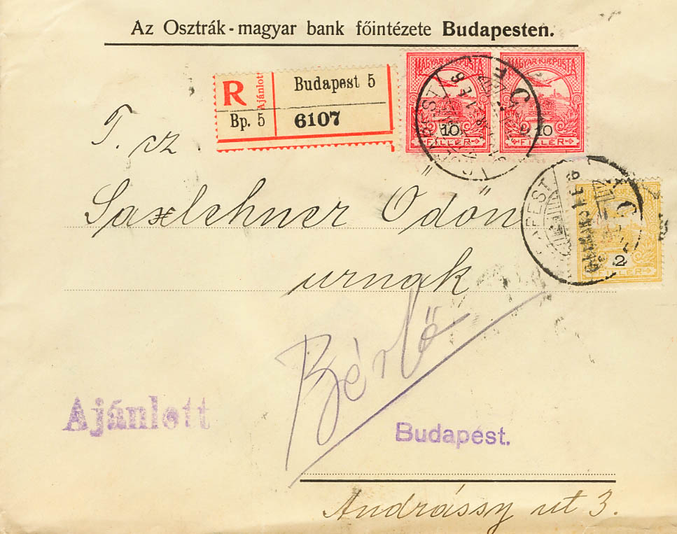 English Yvert 90, 94(2). 1914. 2 f yellow and 10 f carmine, two stamps. Internal Certificate of BUDAPEST. On the back arrival. MAGNIFICENT.