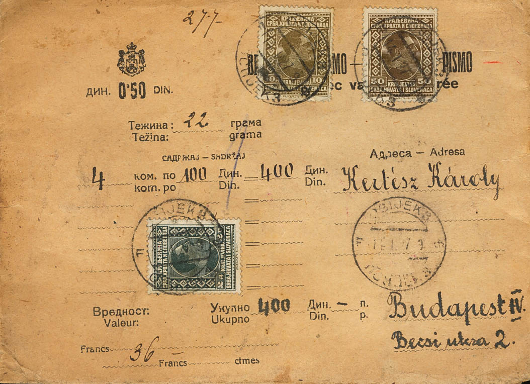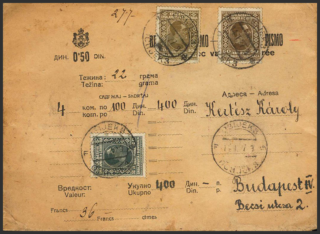 English Yvert 171(2), 173. 1927. 50 p sepia, two stamps and 2 d gray black. Declared Value from OSIJEK to BUDAPEST (HUNGARY). On the back arrival. MAGNIFICENT.