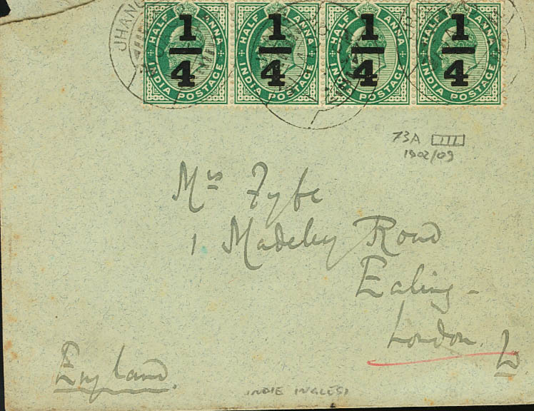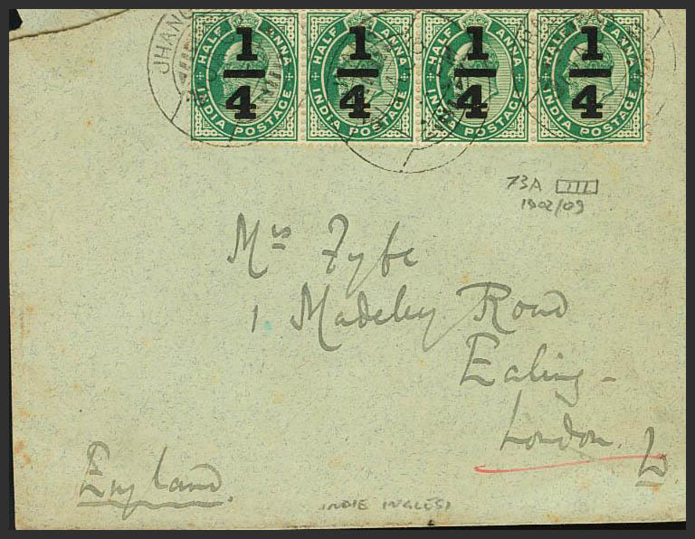 English 1906. ¼ over ½ to green, strip of four. JHANG to LONDON. On the back arrival. MAGNIFICENT AND RARE POSTAGE.