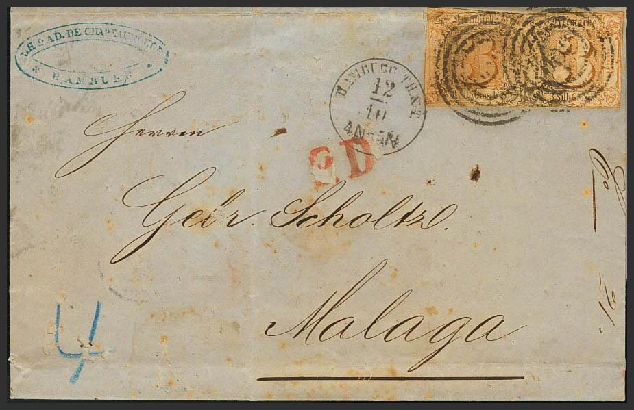 Yvert 19(2). 1865. 3 s bistre, pair (archival fold). BAMBURG to MALAGA. PRETTY.