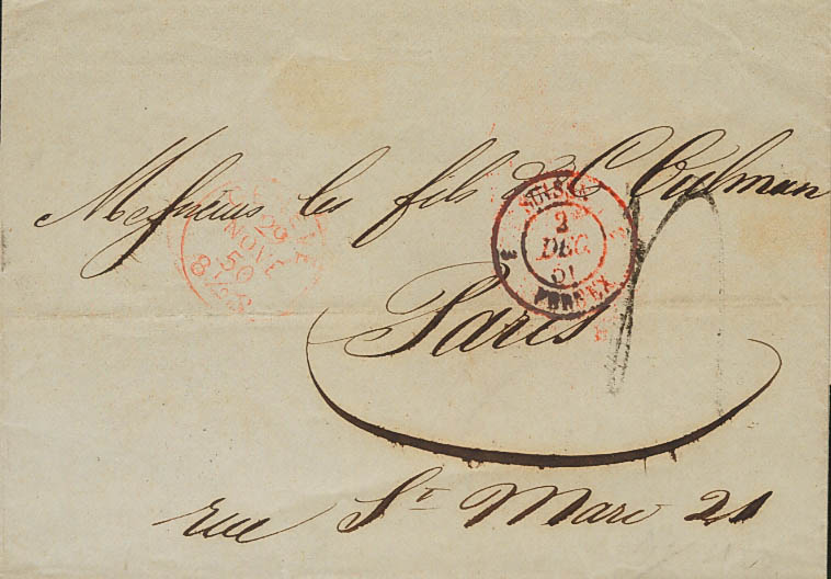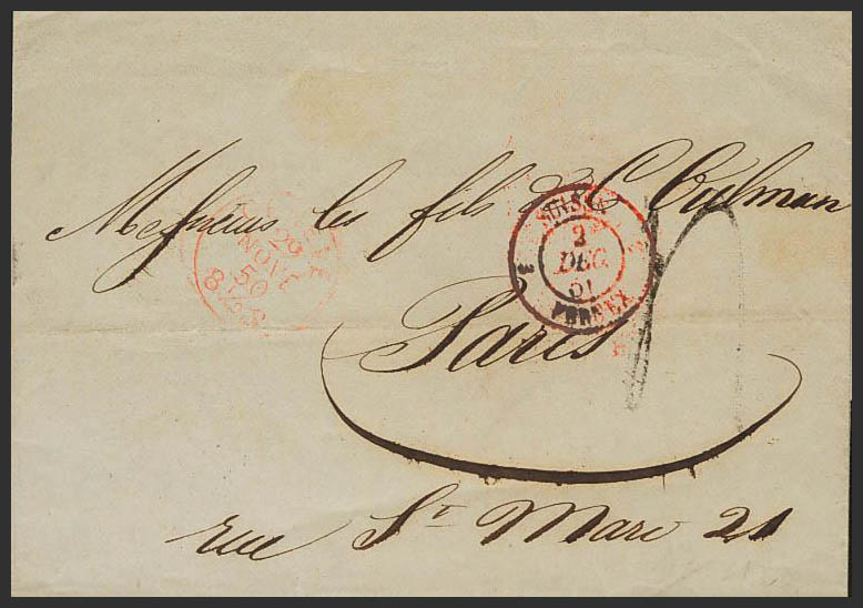 English 1850. GENEVA to PARIS. Dater GENEVE and SUISSE / 3 FERNEX 3, from Switzerland, both in red. MAGNIFICENT.