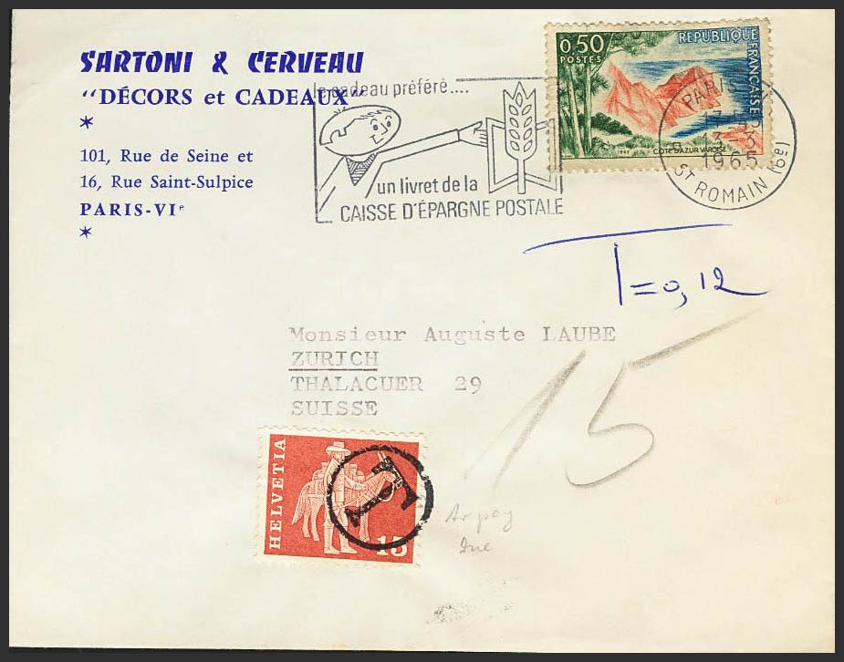 Yvert 645. 1965. 50 cts multicolor. PARIS to ZURICH. Priced on arrival at 15 cts, satisfied with 15 cts chestnut Swiss stamp. MAGNIFICENT.