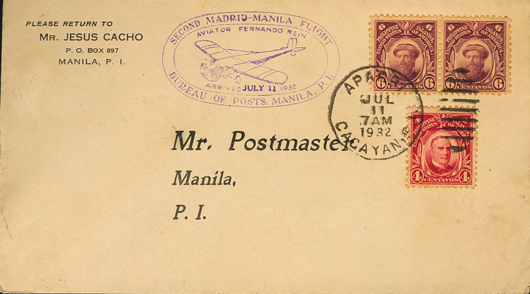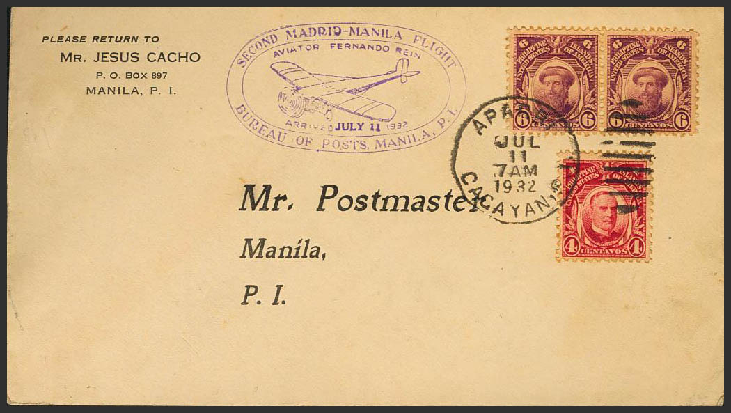 English Yvert 205, 206(2). 1932. 4 cents red and 6 cents violet, two stamps. APARRI to MANILA. On the front brand SECOND MADRID-MANILA FLIGHT / BUREAU OF POST. MANILA, PI, in violet and on the back arrival. MAGNIFICENT.