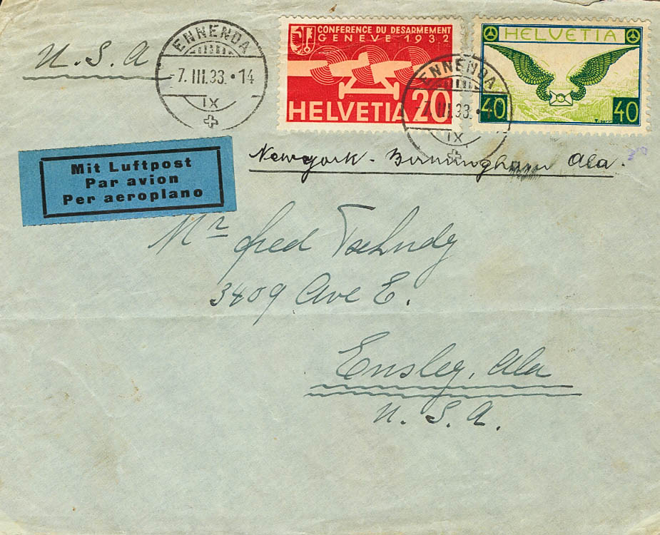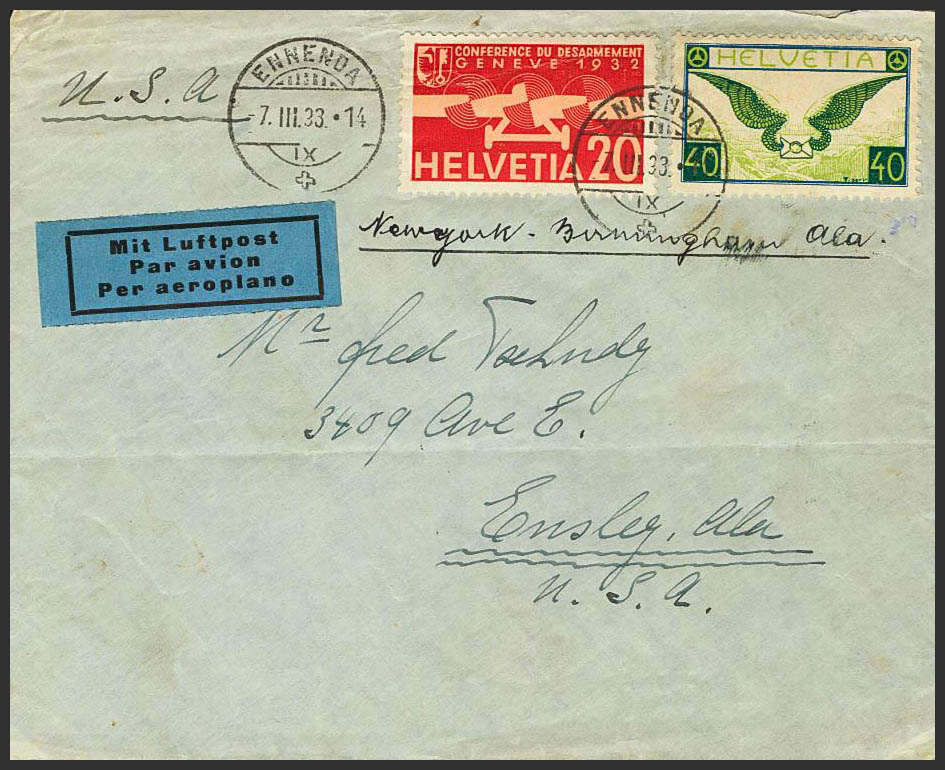 Yvert 14, 17. 1933. 40 cts green and 20 cts red. Airmail from ENNENDA to ENSLEY (USA). MAGNIFICENT.