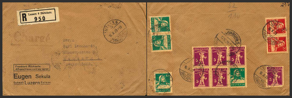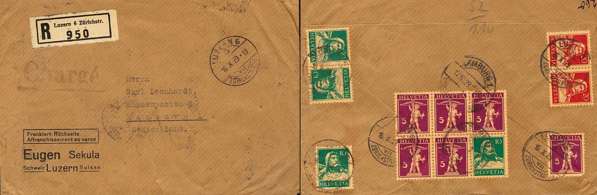 Yvert 198(5), 200, 200a. 1931. 5 violet cts, block of five and 10 blue green cts, joined in block and 10 green cts, pair TETE-BECHE. Certificate from LUCERNE to HAMBURG. On the back arrival. MAGNIFICENT.