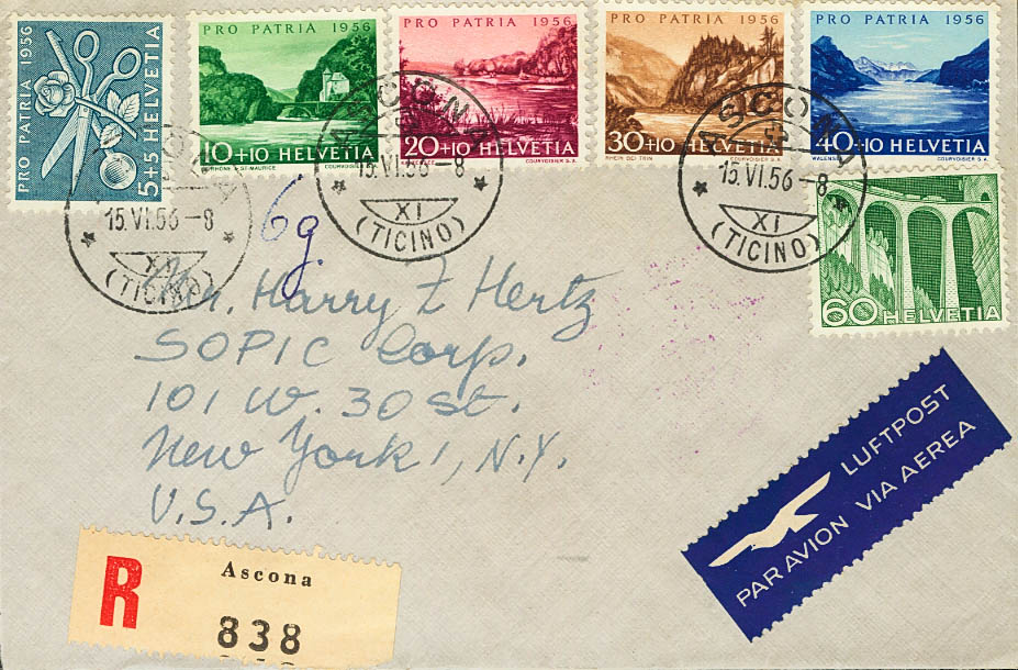 Yvert 576/80. 1956. Complete series and 60 green cts. Certificate from ASCONA to NEW YORK (USA). On the back arrival. MAGNIFICENT.