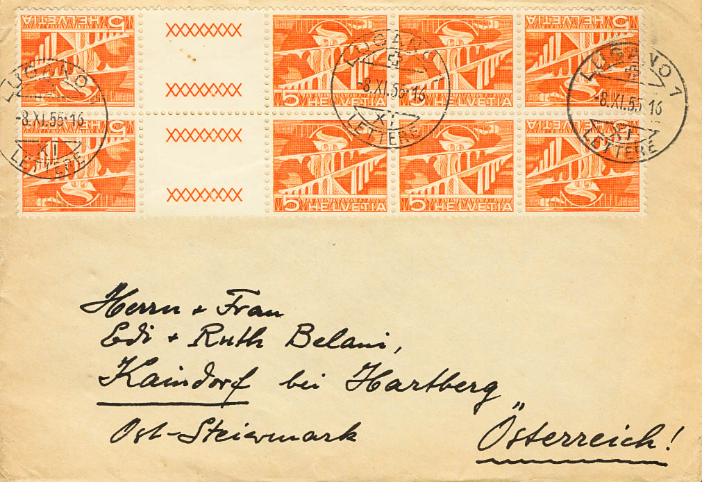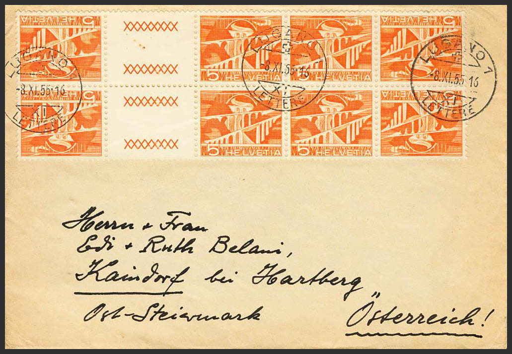 Yvert 482(8). 1955. 5 orange cts, block of eight with interpanel. LUGANO to KAINDORF BEI HARTBERG (AUSTRIA). MAGNIFICENT.